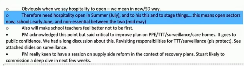 “I’m very clear that I don’t believe that it was, because hospitality had been deemed to be safe to reopen with a considerable – as I said – hundreds of pages of guidance, changes in practice, and had been recommended by think tanks, and had been done by countries elsewhere.