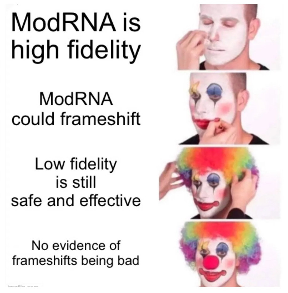 Another magnum opus by Dr Jessica Rose on the frameshifting issue in the jab (creation of foreign ‘junk’ proteins in the body with unknown (but likely damaging) effects). Some of the comments are additionally informative. Plus one cross-posted from Anandamide on the same issue. Coincidence and c*ckup my a*se. https://jessicar.substack.com/p/that-substack-about-n1-methylpseudouridines https://anandamide.substack.com/p/frameshiting-slippery-sequence : So in summary, this Frameshifting risk was known in 2021 and it was censored at the journals and on Twitter. Smoke screen papers like Kim et al appeared so some researches could get some Fauci biscuits. After billions of shots we can now see the warts through the lens of the next patent that will fix the crap forced into our kids. And once again the goal posts begin to shift. It stays in the arm. Oops it doesn’t, but it doesn’t matter It’s gone in 48hrs Oops is still here months later, but it doesn’t matter There is no DNA!!! Ok there is a little, but it doesn’t matter There is no SV40!!! Oops there is, but it’s safe and effective It stops transmission Oops, it doesn’t but it makes it not so bad. It’s good for the immunocompromised and those at risk Oops that was never… Read more »