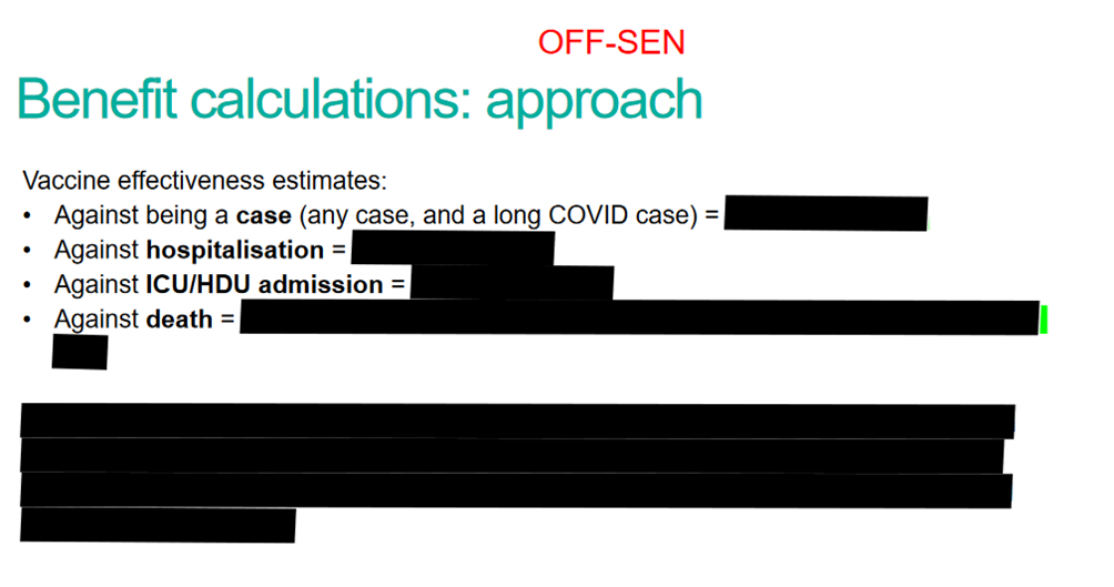 Finally, let’s go back to MHRA’s relative definition of safety: “benefits outweigh the risks”. That might even have been fine if the benefits from the Covid vaccines got better as the risks got worse but, as we all know, the benefits got worse, too. Effectiveness turned out to be less than the manufacturers originally claimed and it waned within months – hence booster after booster. And the vaccine effect on transmission turned out to be illusory. But MHRA doesn’t want you know about the benefit side of the equation. For example, here’s a slide from an internal MHRA presentation just released under an FOI:
