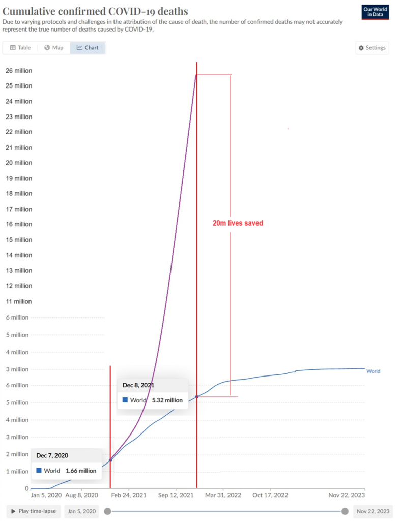 By December 8th 2021, a total of 5.32 million people had, according to Our World in Data, died of or with Covid. According to the good people of Imperial College London, if the vaccines hadn’t existed, 20 million more, some 25.32 million people, would have died by that point.