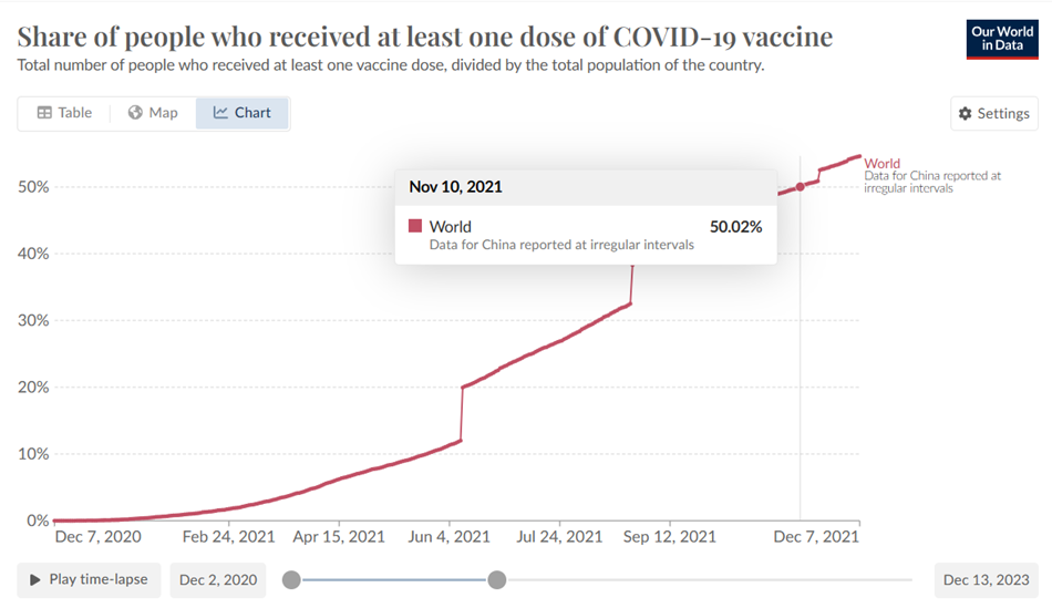 Is this in any way credible? Well, perhaps the first place to have a look is the vaccine stats. To die of or with Covid by December 8th 2021 you would have had to catch it a few weeks earlier, perhaps November 10th. Figure 2 shows the proportion of the world’s population who were vaccinated between December 8th 2020 and December 8th 2021; it wasn’t until November 10th 2021 that 50% of the population had had a single jab. At the beginning of June only around 10% of the World’s population had been jabbed.