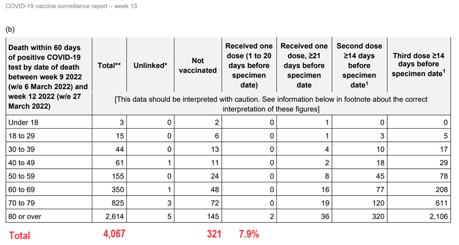 Now here we have to revert to U.K. data as deaths by vaccination status haven’t been published by many countries. But let’s see what we can do. Figure 3 is taken from Table 13(b) of the UKHSA’s Vaccine Surveillance Report for week 13 2022. It shows that only 7.9% of all Covid deaths within 60 days of a positive test were of the unvaccinated. Which, of course, means that 92.1% of Covid deaths were of vaccinated people.