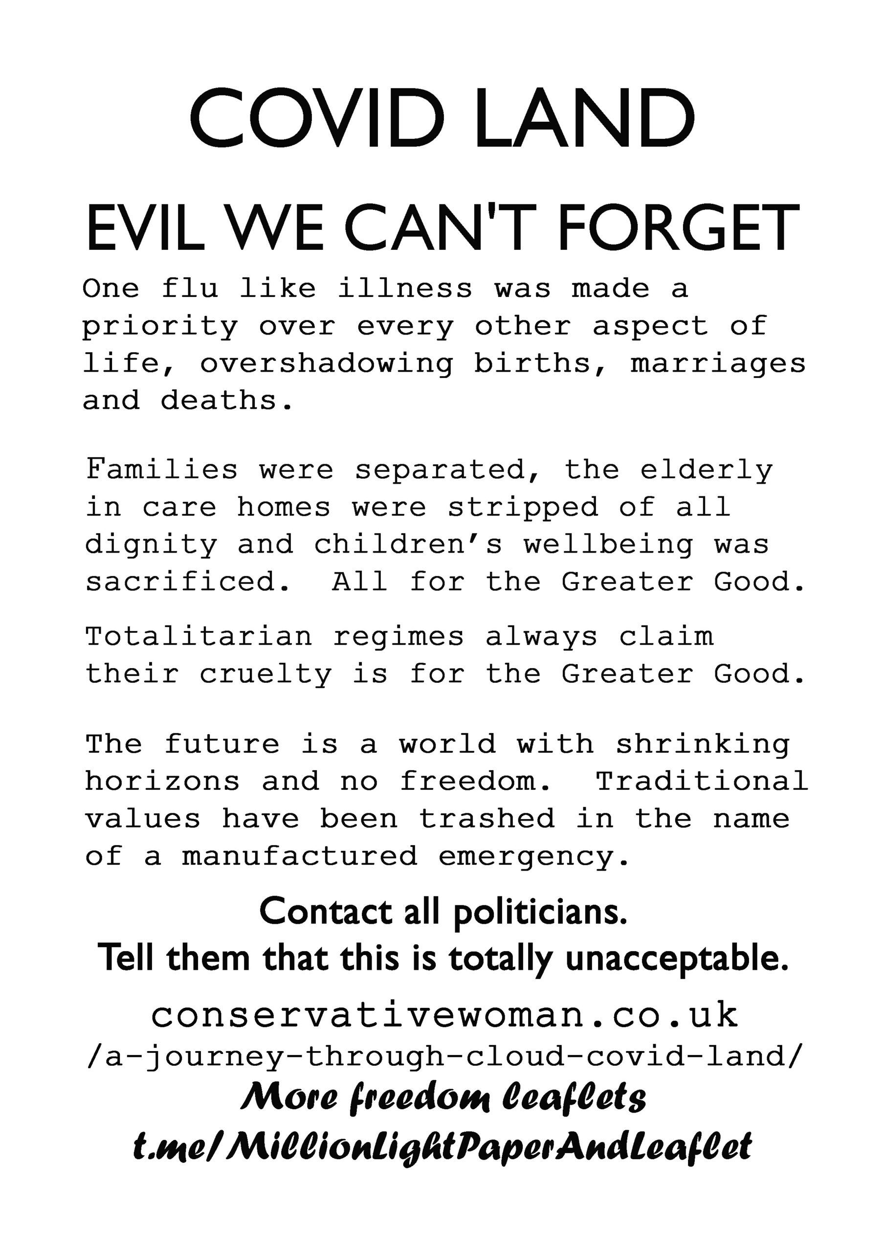 Yes it was a scam and a lie. No, it must not be the end of. We need stories of the extreme negative impact the lockdowns, the outrageously over-hyped predictions, the sob-stories, the media collusion with suppression of the truth – to get the message across that this should never have happened and must never be allowed to happen again. We need Jo(e) Bloggs to realise that the WHO is trying to make it easy to do lockdown again – faster, harder. That the reason their kid doesn’t speak yet is because of the insane restrictions. That the reason that Granny died alone was because of the cruelty of the rules. That people’s livelihoods were ruined, and that it all has to be paid for.