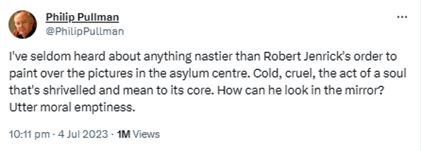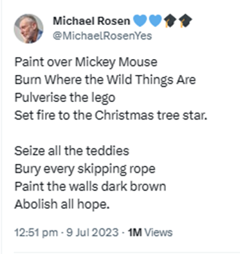 Staff were reportedly “horrified” by this “cruel order”, and initially tried to refuse doing as they were told, like typical civil servants these days, whilst a Private Eye cartoonist hyperbolically offered to repaint them, as “it’s all you can do about this kind of evil”. Outraged children’s author Philip Pullman lifted what sounded like a quote about Scrooge straight from A Christmas Carol, calling Jenrick’s action “Cold, cruel, the act of a soul that’s shrivelled and mean to its core”, whilst Michael Rosen, the professional Left-wing propagandist and former Children’s Laureate, furiously typed out a parody of Auden’s ‘Stop All the Clocks’, entitled ‘Paint Over Mickey Mouse’.