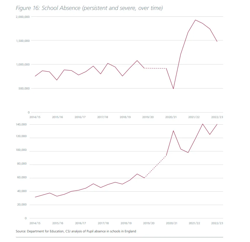 The number of children who are absent from school more frequently than they are present has more than doubled in England from 2019-2023 and shows no sign of coming down – indeed, it is increasing (no doubt because school was made to feel optional by adult decision-makers in 2020). That’s, for the avoidance of doubt, a more-than-doubling of the number of children who have essentially no hope of making a positive contribution to society in the long term and are very likely to end up becoming involved in crime, drugs, prostitution and so on. Never mind ‘building back better’; we’re having to work very hard to stop the building collapsing altogether, across the piece.