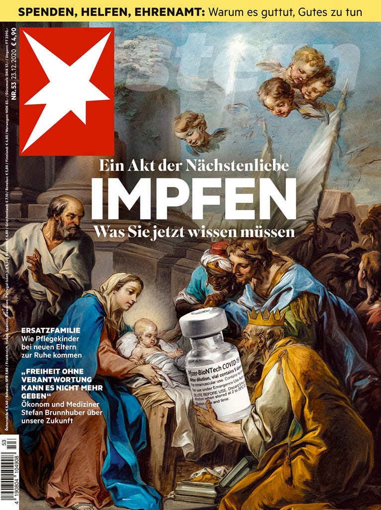 Consider the below cover of the German mass-circulation weekly Stern from December 23rd, 2020. The Pfizer-BioNTech vaccine had become the first COVID-19 vaccine to be authorised in the European Union two days earlier on December 21st; rollout of the vaccine in Germany would start the day after Christmas.
