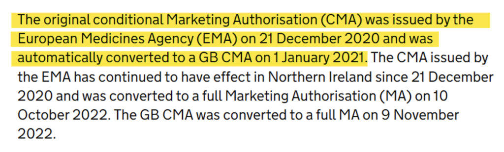 This implies in turn that the German PEI has done the “scientific work” underlying the authorisation of the BioNTech-Pfizer vaccine not only for the entire EU, but even for a country which has left the EU: namely, Great Britain. This is because the British authorisation is nothing other than a rebranded version of the EMA authorisation, as can be seen here (bottom of page) and below.