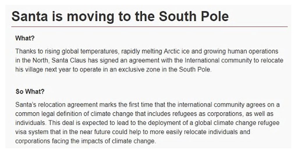 This same Irish Times piece also suggests that “Increasing desertification, combined with loss of polar ice, could put pressure on Santa to switch to camel-powered flight” instead, but at least the article is mostly tongue-in-cheek.