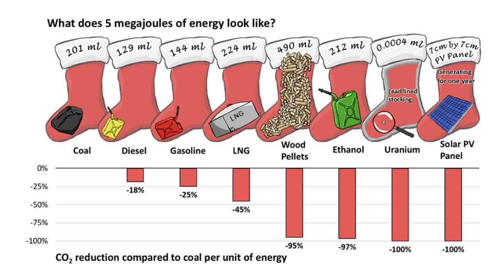 By Christmas 2017, though, the Canada Energy Regulator (CER) website was stating: “Santa is phasing out coal at the North Pole in an effort to help Canada meet its climate change commitments… Instead of lumps of coal, Santa will give naughty children an alternate fuel that emits less carbon dioxide.” Apparently, “Santa usually gives naughty children a lump of coal about the size of a small apple containing around 5 megajoules (MJ) of energy” so “Mrs. Claus created a graph comparing other options that also have 5 MJ of energy”, like so: