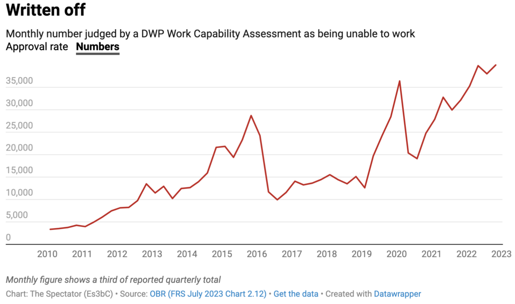 In short, the rise of mental health complaints has discombobulated the welfare system with high numbers being sent to the economic scrap heap deemed unable to do any work. It’s now at almost 40,000 a month: