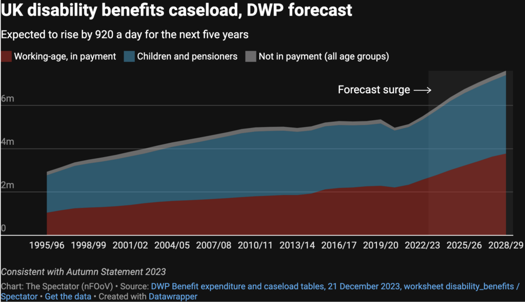 In the Spectator, Fraser Nelson explores the U.K.’s pressing welfare crisis, citing a surge in mental health complaints, scepticism about proposed reforms and the crucial need for public debate before 2024. Here’s an excerpt: