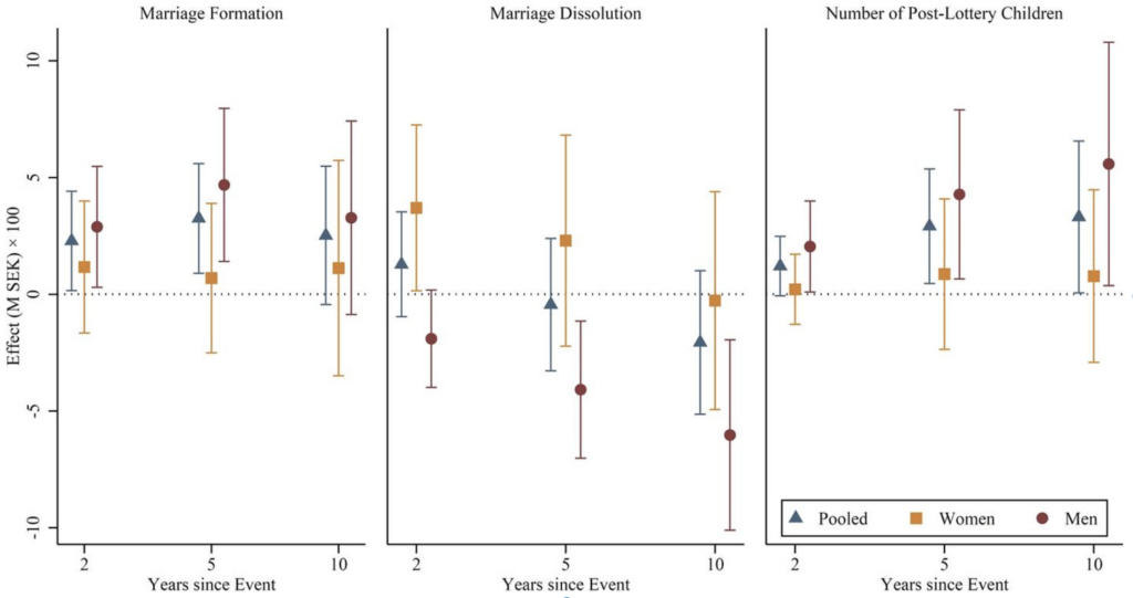 This model is backed up by the effects of random wealth shocks (from a lottery) on family formation. Men get married, save their marriages and have more children. Women don’t get married, get divorced if already married and have fewer children.