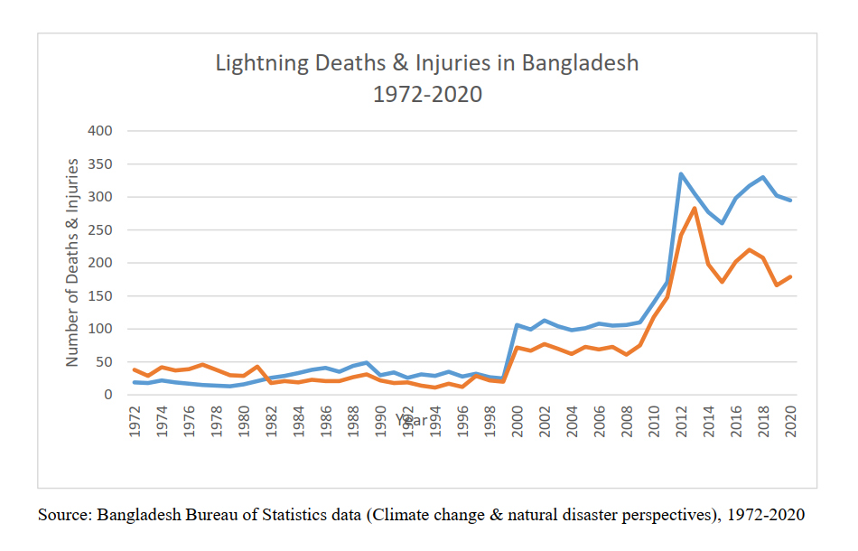 The article links to a web page on the United Nations Capital Development Fund’s website. No, I’d never heard of it either. In hyperbolic language typical of the UN, it states there has been an increase in the frequency of thunderstorms in this part of Asia and that this is a cause of the increase in lightning strike deaths. It doesn’t provide supporting evidence, but a bit of googling reveals that in Bangladesh, over the last 40 years or so, there has indeed been a rising trend in the number of thunderstorms each year.