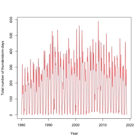 The thunderstorms there are probably unaltered this looks rather like an improvement in data recording starting in around 1990. It is preposterous bs to claim there is any terrifying pattern here and moreover link that to co2 concentrations which would be marginally monotonic over the period.