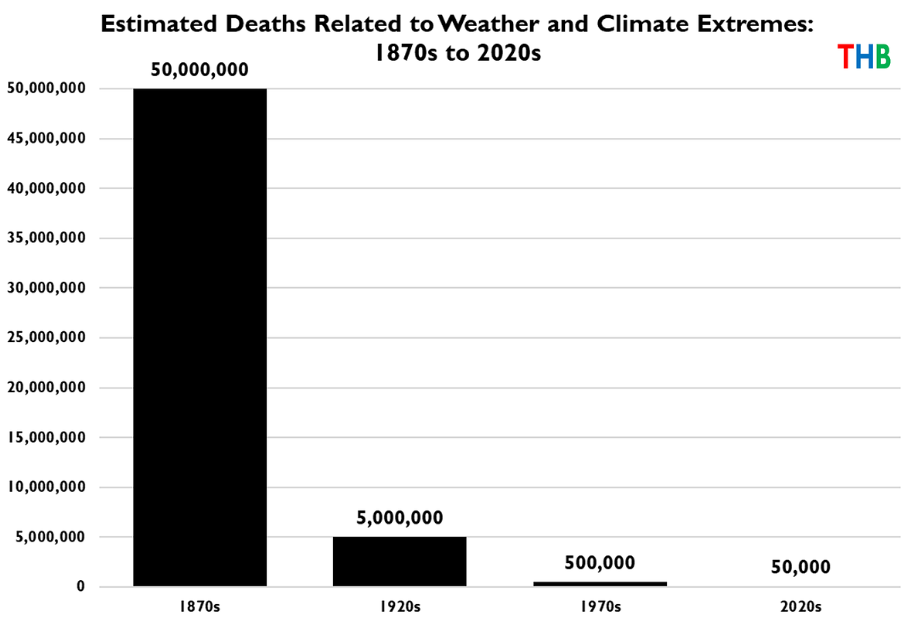 Pielke provides the above graph which shows the dramatic fall in estimated deaths caused by extreme weather since the 1870s. Caution is advised since the estimates are uncertain, although he notes the 1870s and 1920s numbers are certainly under-estimates. While not precise figures, they provide orders of magnitude guidance.