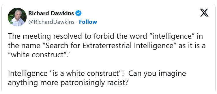 Krauss has been told many proper SETI scientists despair that it is consequently growing โharder and harder to actually carry out [meaningful] SETI researchโ, and they fear being pushed out due to being politically incorrect. Whatโs more, Charbonneau seems to have got her wish, with the very word โintelligenceโ now allegedly banned by SETI, as it is โa white constructโ. Hereโs an angry Richard Dawkins, tweeting about it: