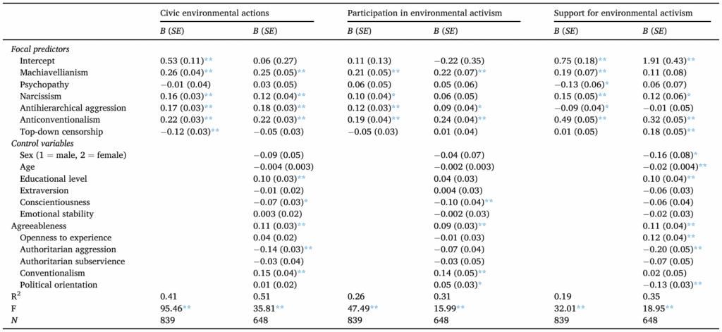 As you can see, Machiavellianism, anti-hierarchical aggression and anti-conventionalism were consistent predictors of involvement in environmental activism, while narcissism and anti-conventionalism were consistent predictors of support for environmental activism. Hence the associations Zacher observed could not simply be attributed to confounding by demographic characteristics – not in every case, at least.