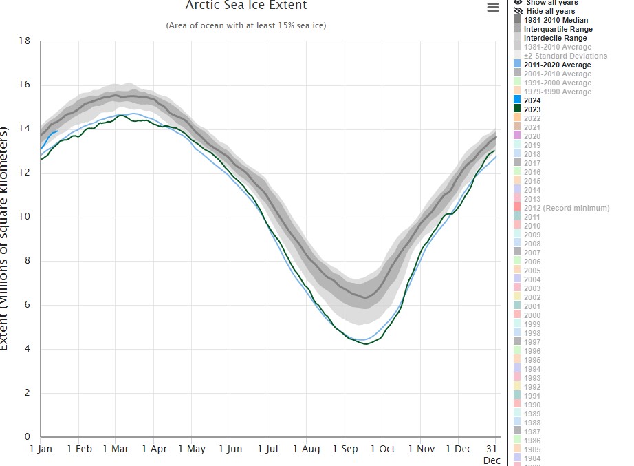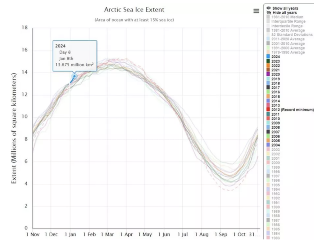 The dramatic, if largely unpublicised, recovery in Arctic sea ice is continuing into the New Year. Despite the contestable claims of the ‘hottest year ever’ (and even hotter in 2024), Arctic sea ice on January 8th stood at its highest level in 21 years. Last December, the U.S.-based National Snow and Ice Data Centre (NSIDC) revealed that sea ice recorded its third highest monthly gain in the modern 45-year record. According to the science blog No Tricks Zone, the reading up to January 8th has now far exceeded the average for the years 2011-2020. It also exceeds the average for the years 2001-2010, and points directly upwards with regard to the average for the years 1991-2000.