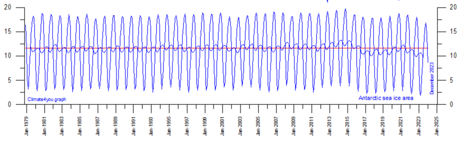 Three cheers for the longer record. It doesn’t seem to get much of a look-in these days as the Earth starts to boil. Below, Professor Ole Humlum maps the sea ice extent in Antarctica going back to 1979.