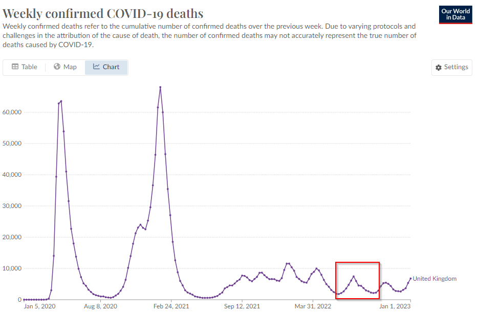 The first thing to be said is that the period chosen is strange. The summer is obviously not the usual season for coronaviruses and those weeks in 2022 were one of the low points for Covid deaths compared to earlier in the pandemic – though there was a small spike associated with one of the Omicron subvariants (the red box below shows the study period). The late period is picked presumably because by this point the take-up of the endless ‘boosters’ on offer was seriously waning and so this allows the authors to press their main point, which is that skipping your boosters can be deadly. However, it hardly counts as a typical period for Covid deaths.