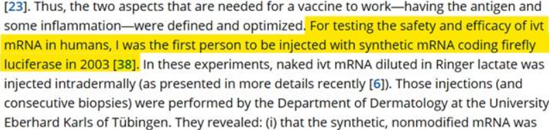 Thus in his recent history of synthetic mRNA vaccines in the European Journal of Immunology, Steve Pascolo notes that in 2003, when he was the CSO of CureVac, he became “the first person to be injected with synthetic mRNA”, in order to test “the safety and efficacy of ivt mRNA in humans”. See the below excerpt.
