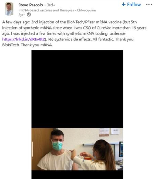 In a LinkedIn post celebrating his second dose of the BioNTech-Pfizer COVD-19 vaccine, Pascolo notes that he was in fact injected not once, but three times with synthetic mRNA for experimental purposes.