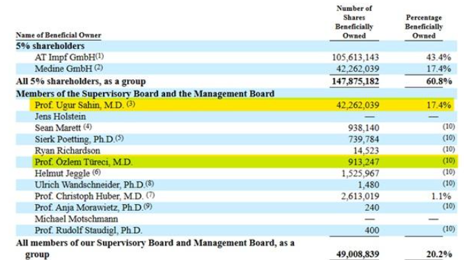 One thing is certain: if this is the case, Türeci would not willingly tell us. It is not the job of the Chief Medical Officer of a publicly-listed pharmaceutical company to destroy shareholder value. And, in any case, both Türeci and her husband themselves form part of BioNTech’s main ownership group, as can be seen in the table from BioNTech’s latest annual report to the SEC below.