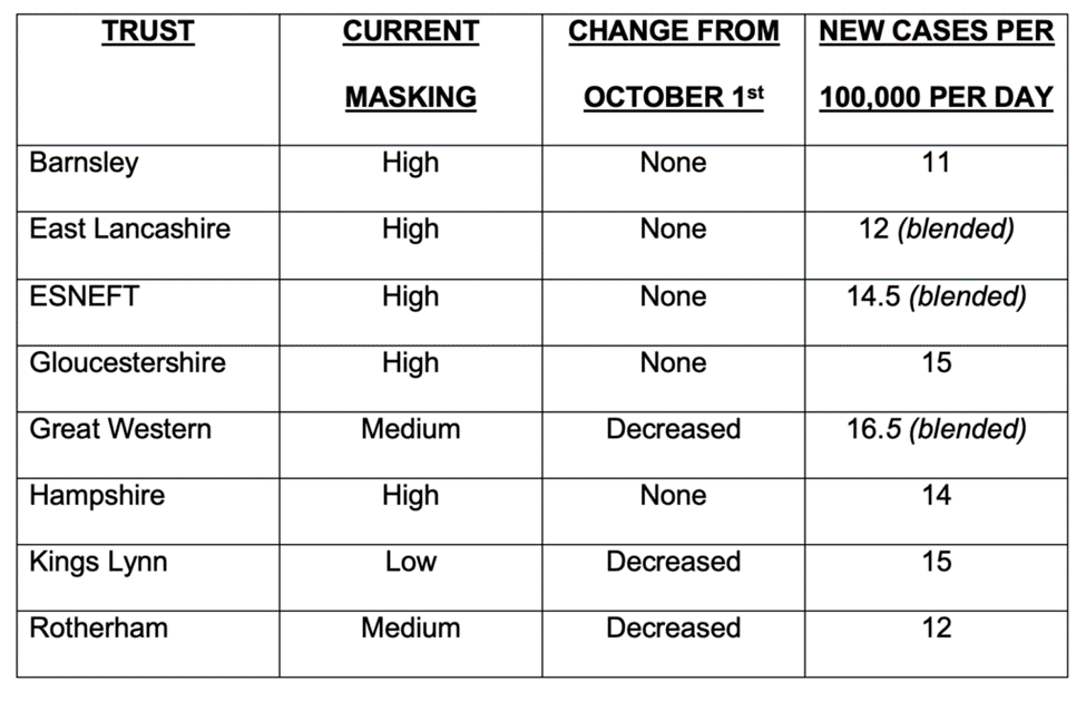 Were those trusts imposing mask “requirements” in areas of above-average Covid prevalence? It appears not; there was no discernible pattern and, in fact, glaring contradictions. For example, Barnsley, with continuing significant restrictions, had a catchment area with the lowest daily new cases per 100,000 people; while Swindon and surrounding areas, served by the Great Western Trust that had reduced its mask restrictions, had the highest rate.