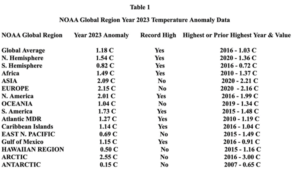 The above table shows the wide differences in 2023 temperature anomalies across the planet. Warming has been almost non-existent in Antarctica, but land areas with ever-expanding urban areas often produce the highest anomalies. The global anomaly rise of 1.18°C corresponds to a temperature of 15.08°C, and is relative to a NOAA 1901-2000 baseline average of 13.9°C. Cue for catastrophist’s alarm is the three 20ths of a degree centigrade increase from the previous higher figure in 2016, an amount well within any margin of error, and as we shall see, unmeasurable with any convincing accuracy.