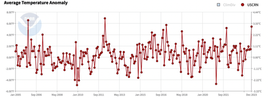 The rarely-referenced USCRN was set up by NOAA in 2005 using around 114 carefully sited temperature measurement stations across the contiguous U.S. in areas well away from urban development. As can be noted, very little warming can be seen over nearly two decades. Hamlin states that there is no increasing average temperature anomaly trend in the U.S. with the 2023 outcome exceeded by numerous years including 2016.