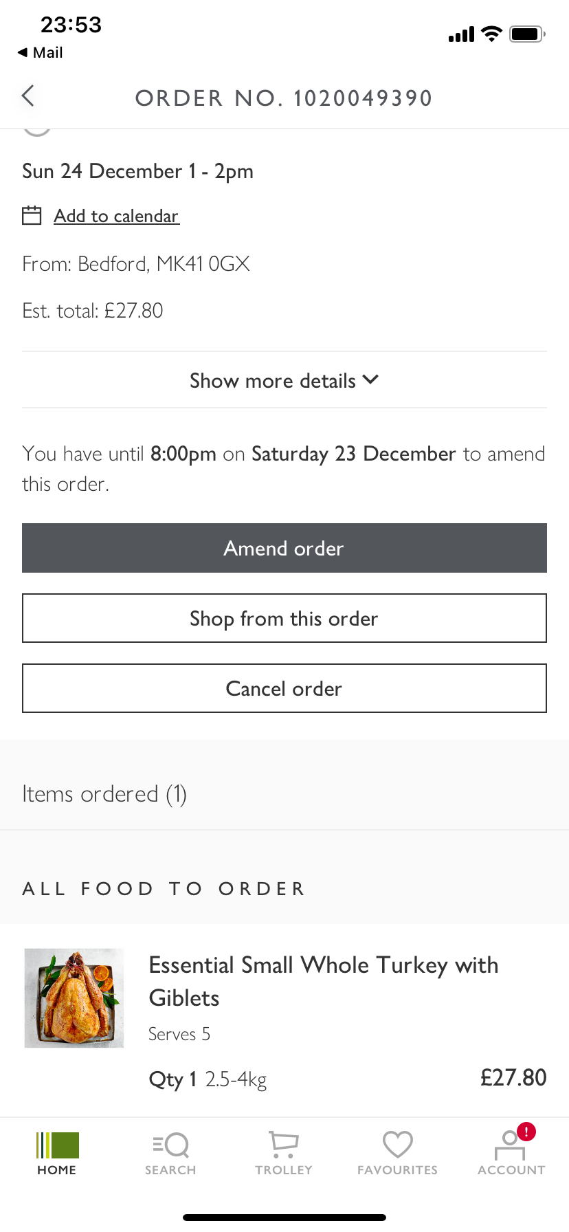 Please ignore the Waitrose Christmas order I have absolutely no idea where that came from I have tried several times to delete it but the system just goes into an endless loop.