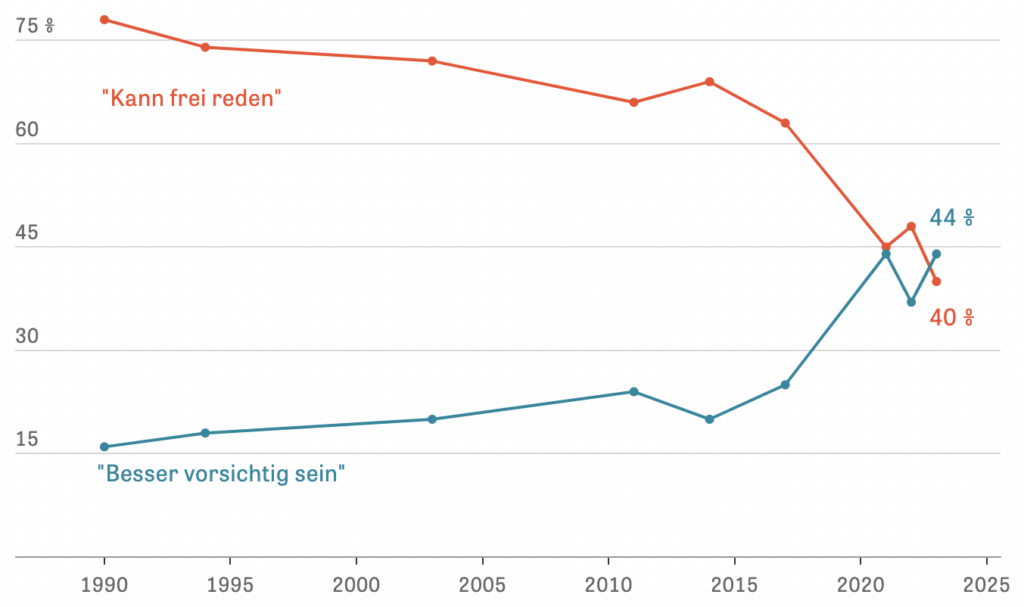 We know that large percentages of academics and students refrain from expressing their views on certain topics for fear of being denounced, mobbed or formally sanctioned. Self-censorship on campus is frequently discussed in the media – and rightly so. But what’s the situation in the population at large? And how has it changed over time?