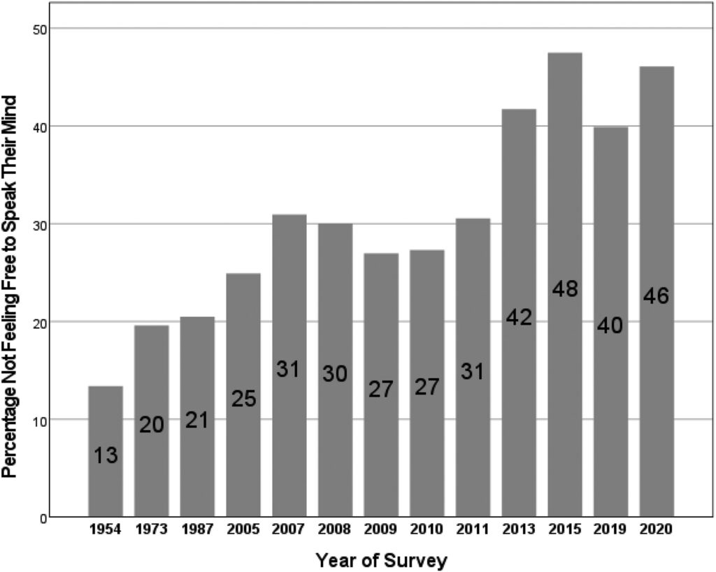 There is a clear increase in self-censorship. (Although note that the years on the x-axis are not always consecutive because they represent the specific years in which surveys were available.) In 1954, only 13% of Americans said they did not feel free to speak their mind. By 1987, this had grown to 21%; by 2011 to 31%; and by 2020 to 46%.