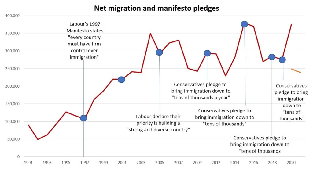 Here’s a chart plotting net migration to the UK; four separate pledges the Tories have made to bring immigration down to the “tens of thousands” are highlighted. As you can see, these pledges were completely worthless. Net migration remained above 200,000 throughout the entire period. And as a matter of fact, it has since risen above 500,000.