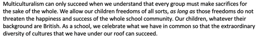 We all “must make sacrifices for the sake of the whole”, being allowed “freedoms of all sorts, as long as those freedoms do not threaten the happiness and success of the whole… community”. So, no meat for any remaining local white British Christian kids who would previously have been perfectly free to eat the stuff since the year dot, but they do now get alternative new “freedoms of all sorts”, such as the ‘freedom’ to nibble on boiled cabbage, limp carrots or damp lettuce instead, none of which many of them might actually have preferred to a nice hot bacon sandwich. But never mind, “We all make our sacrifices so that we can live in harmony”.