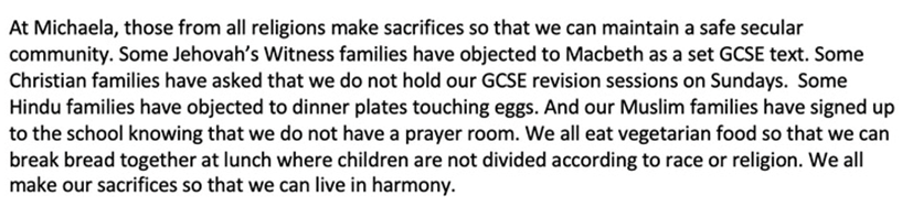 According to her lawyer, this allegedly discriminatory treatment had “fundamentally changed how she feels as a Muslim in this country”. Yes. For once, she hadn’t just been supinely pandered to. Despite the loud claims of religious discrimination, it turned out the prayer ban actually applied not only to Muslims, but to kids of all faiths, even Satanists. If Michaela School ‘discriminated’ against its pupils, then it discriminated against all of them on a fundamentally equal basis – which, as we shall see, is actually something of a double-edged sword.