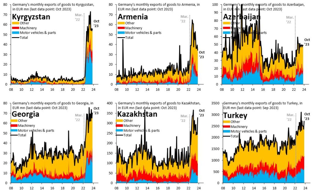 Interestingly, the pattern is similar when you look at German exports (shown above). Shortly after the start of Russia’s invasion, the total value of goods sold to Kyrgyzstan, Armenia, Georgia and Kazakhstan went through the roof. As economist Robin Brooks notes, “it’s obvious this stuff is going to Moscow”.