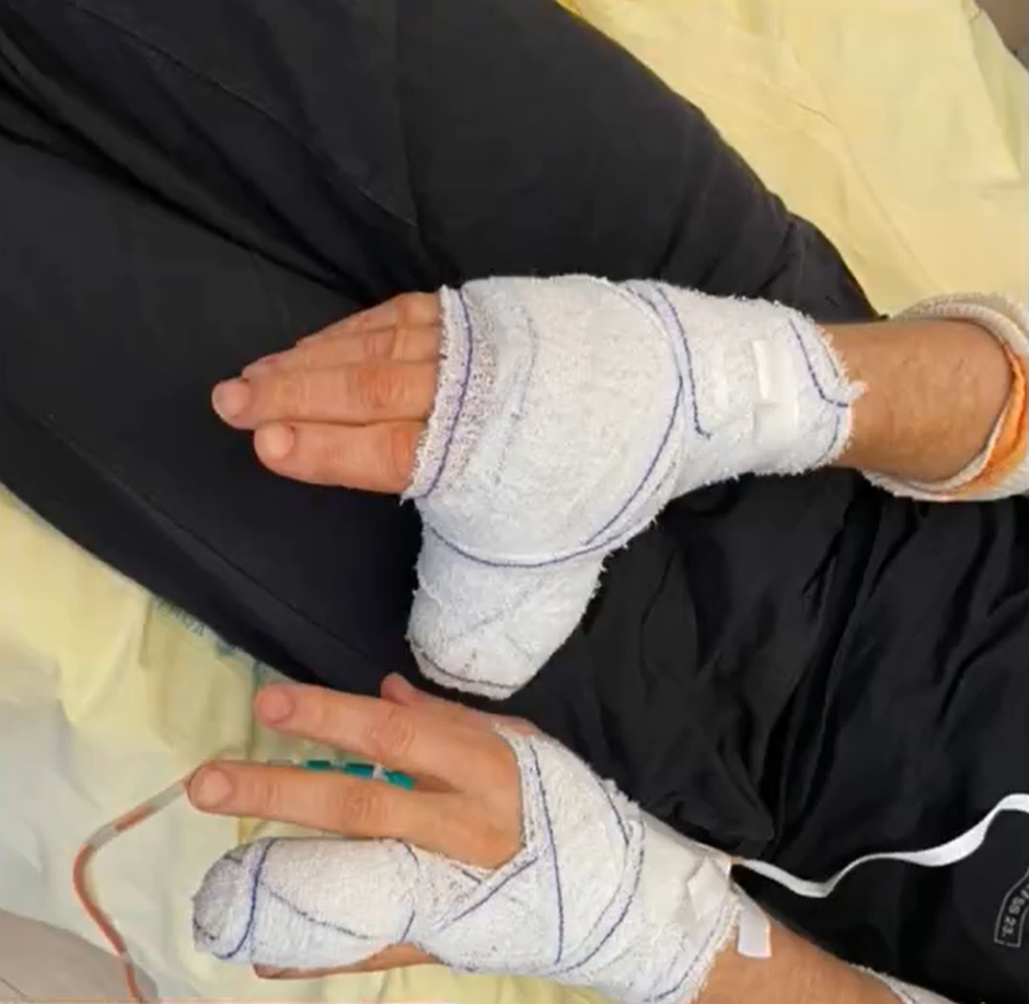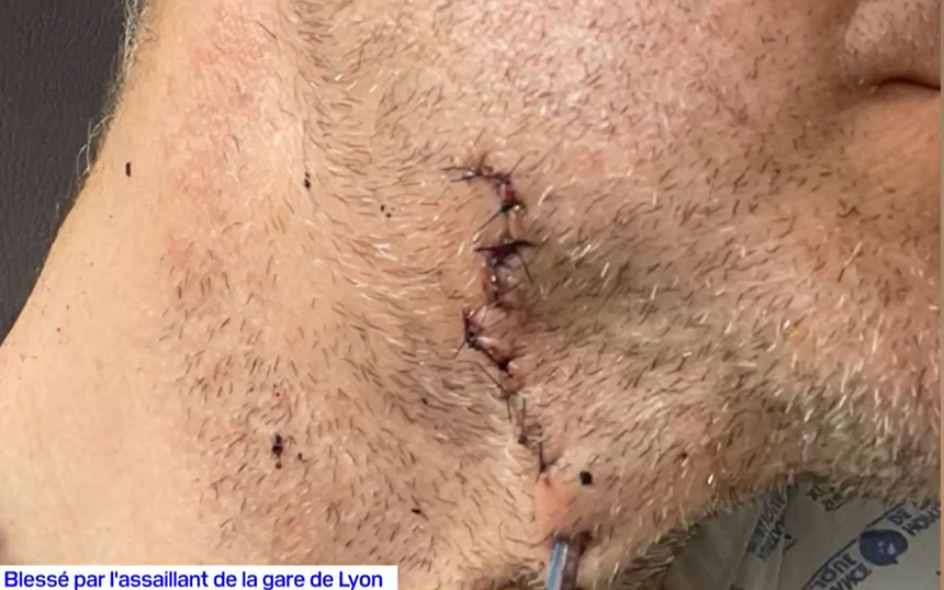 In the report on France’s BFM news television from which the images are taken, Christophe describes pinning Kassogue to the ground after another traveller had tackled him and becoming dimly aware that the assailant’s knife was in his neck. He suffered the wounds to his hands when trying to pull the assailant’s hand back, a reflex which undoubtedly saved his life.