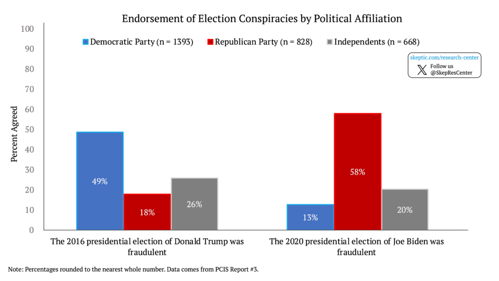 According to a recent survey, the percentage of Democrat and Republican voters who endorse election conspiracy theories is remarkably similar. Sceptic Research Centre asked 3,000 Americans whether they agreed that the 2016 and 2020 elections were “fraudulent”. Results are shown below.