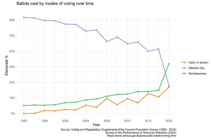Mail in voting has risen steadily in the USA and was about 20% in 2016. There was a sharp increase in 2020 but that is hardly surprising given fears over Covid (well founded or not).