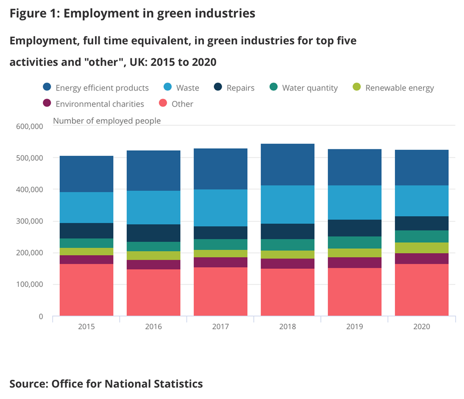 There are also a large number of ‘make work’ jobs listed in the ONS report including environmental charities, environment-related education, in-house environmental activities and environmental consultancy. Speculative ventures that are unlikely to turn into significant future businesses such as hydrogen supply and carbon capture and storage are included.