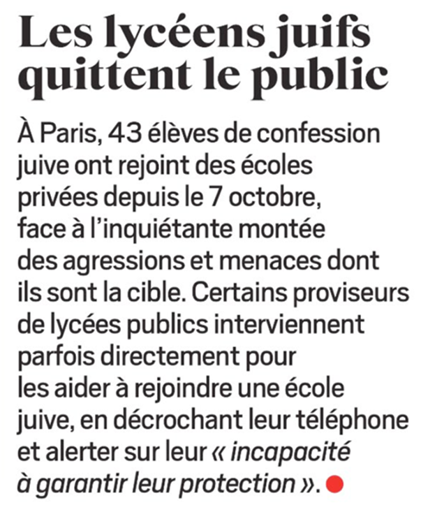 In Paris, 43 students of the Jewish faith have joined private schools since October 7th in response to the troubling rise in attacks and threats against them. Some Principals of public high schools are sometimes intervening directly to help them join a Jewish school by picking up their phones and to warn about their “inability to ensure their protection”.