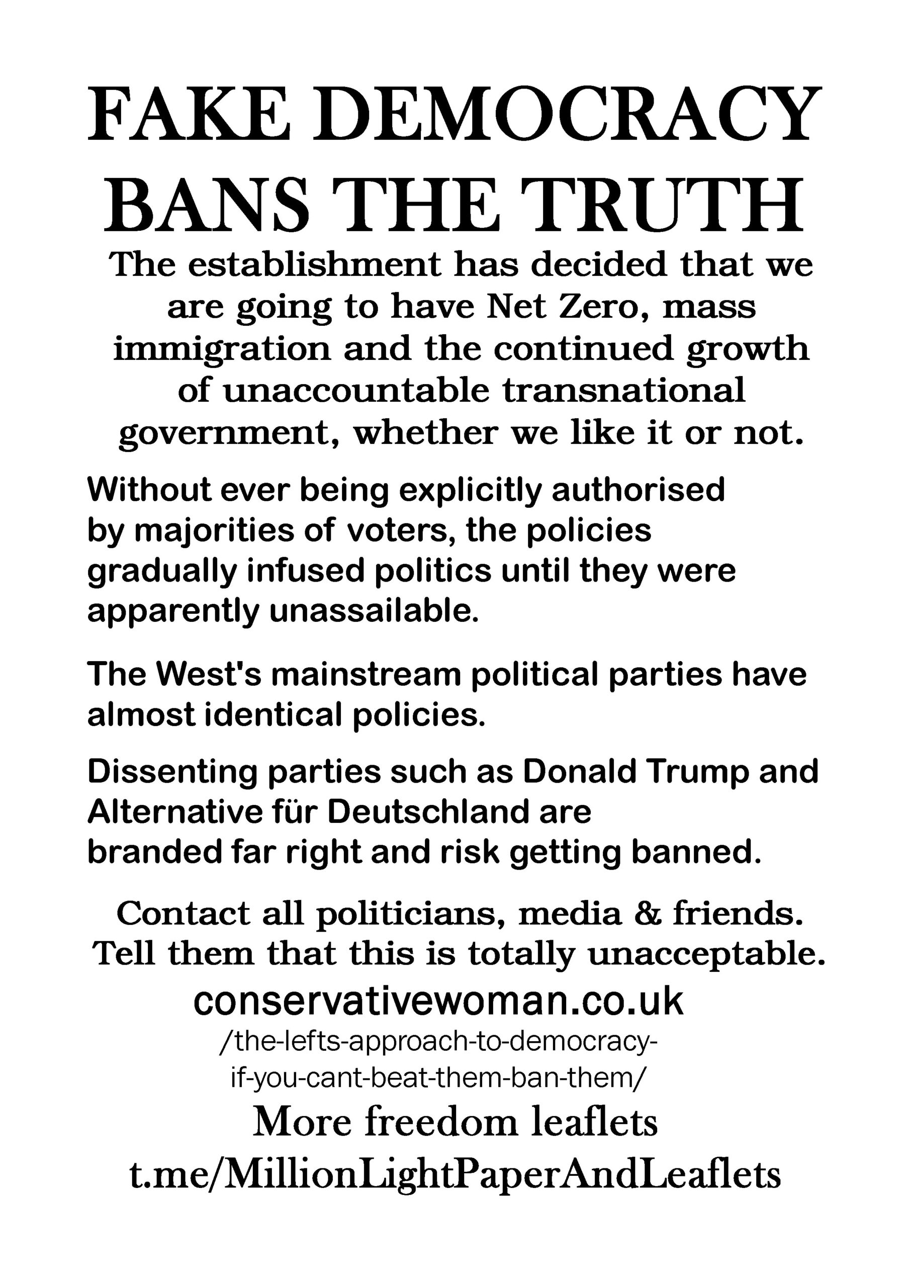 Fake Democracy Bans The Truth – latest leaflet to print at home and deliver to neighbours or forward to politicians, media, friends online.