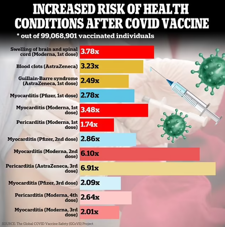 They confirmed that the shots made by Pfizer, Moderna, and AstraZeneca are linked to significantly higher risk of five medical conditions – including a nerve-wasting condition that leaves people struggling to walk or think.
