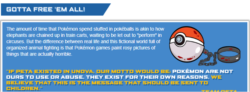 Particularly notable are PETA’s attempts to grab the attention of kids by targeting videogames as with its piggybacking (a phrase which, as we shall soon see, is highly ‘animal-racist’) upon the release of the 2012 Nintendo DS game Pokémon Black & White 2 by making an online knock-off parody, PETA’s Pokémon Black & Blue: Gotta Free ‘Em All. This made the rather hyperbolic claim that the gameplay in Nintendo’s real title, which involved players collecting fictional cartoon animals from the equally fictional land of Unova inside tiny balls, then forcing them out again to battle one another with their unique magical powers, encouraged small children to engage in bouts of playground cockfighting. Furthermore, according to PETA’s associated website: