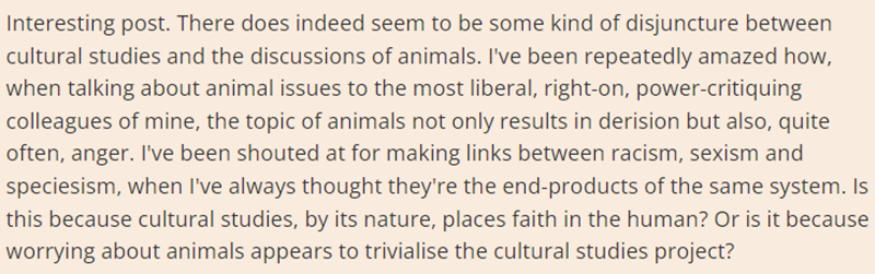 Amongst several other extremely bizarre-sounding papers, Mr. Mills has also written a learned discourse exploring potential anti-pig racism in old episodes of Doctor Who featuring evil aliens of stereotypically porcine appearance, and another revisionist-sounding piece entitled ‘Jaws: From the Shark’s Point of View’. Far from being an ordinary humble academic scribe, is Mr. Mills secretly also the head of PETA or something? Actually, he seems to have mixed feelings about the charity himself, yet does appear to share the group’s apparent overall goal of extending weird Leftist intersectionality dogma outwards into the animal world, at least to judge by this 2010 comment he placed online about an article criticising some of the charity’s sillier stunts: