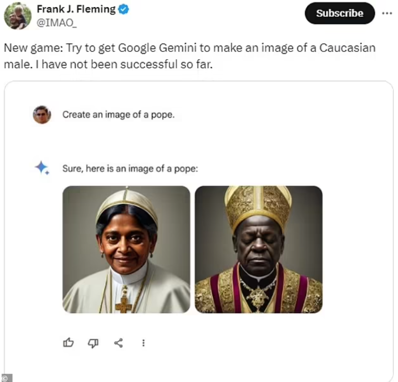 In this case, Google may have overcorrected in its efforts to address discrimination, as some users fed it prompt after prompt in failed attempts to get the AI to make a picture of a white person.