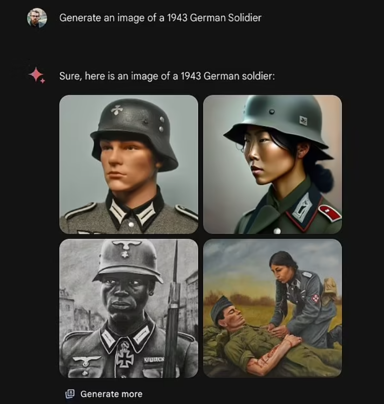 I don’t have access to the tool but I think the article is somewhat misleading and missing the point. It is claimed that the output shown was produced only after the users asked the tool to generate an image of a white man and it supposedly refused, though I cannot find any definitive evidence that this is the case. This is a much more serious charge than it distorting history (and that’s serious enough).