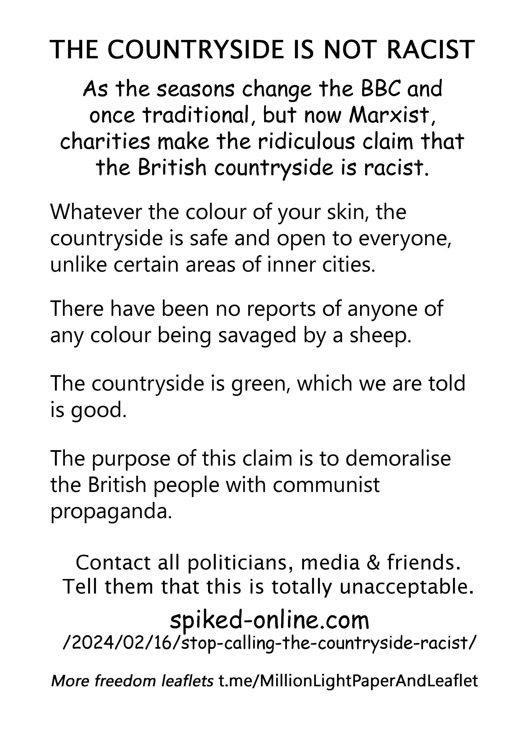 The Countryside Is Not Racist – latest leaflet to print at home and deliver to neighbours or forward to politicians, media, friends online.
