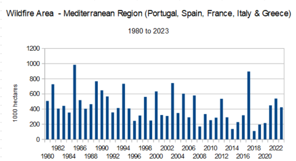 Writing in the Daily Telegraph last July, Suzanne Moore reported that the “world is on fire – and we can’t ignore it any longer”. She was noting the usual outbreaks of summer wildfires in southern Europe and suggested a retreat by cautious holiday makers in Rhodes away from one conflagration was “what climate refugees look like”. The Guardian was in similar hysterical mode observing that the lesson from Greece was “the climate crisis is coming for us all”. Such was the level of Thermogeddon interest last summer it is curious that final figures for areas burnt during the year are missing from mainstream media. In the five largest southern European countries for which the EU provides separate data – Portugal, Spain, France, Italy and Greece – 2023 was only the 20th highest in the modern satellite burnt acreage record going back to 1980.